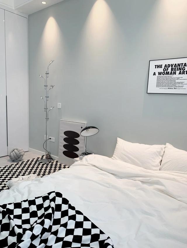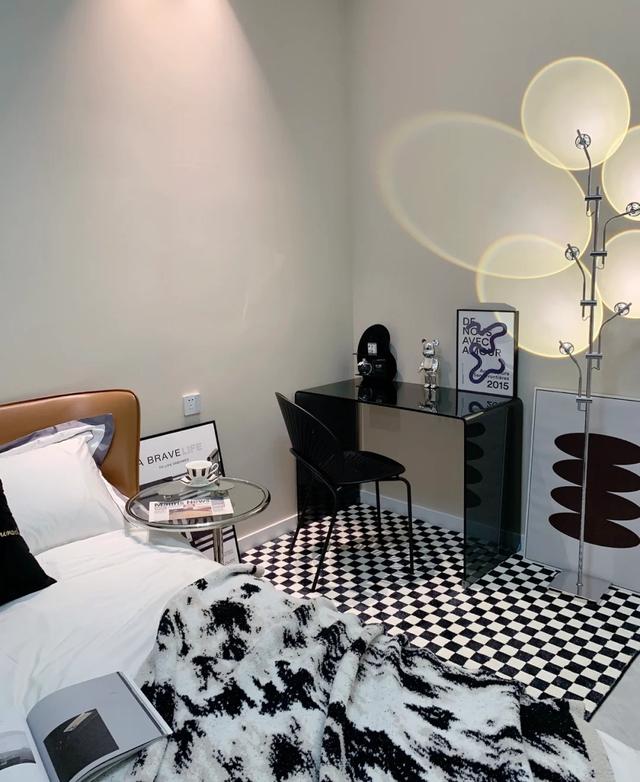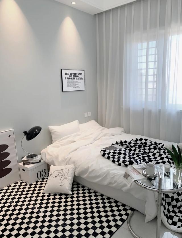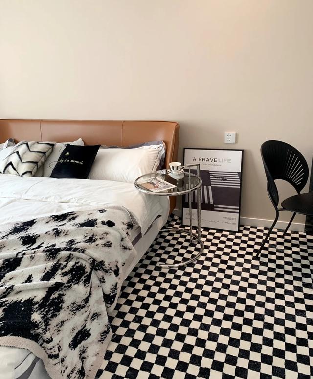卧室以黑白色调为主,经典的棋盘格让整体空间时尚起来,看起来简约又时尚。地垫直接使用,不仅在视觉效果上让卧室看起来更加通透宽敞,更具整体感和高级感,也提升了卧室的档次感。