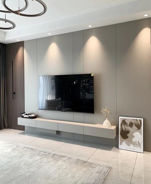 电视柜采用悬浮式设计,利用墙面扩大空间面积突出层次感,营造出轻盈舒适的视觉感受,从而具有扩大空间的效果。