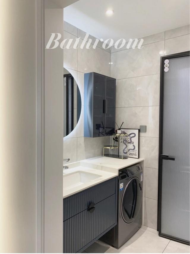干区墙面定制收纳柜,与浴室柜收纳配套。整个空间整洁干净。浴室柜定制时预留了洗衣机的尺寸,高低桌的设计让空间层次分明。