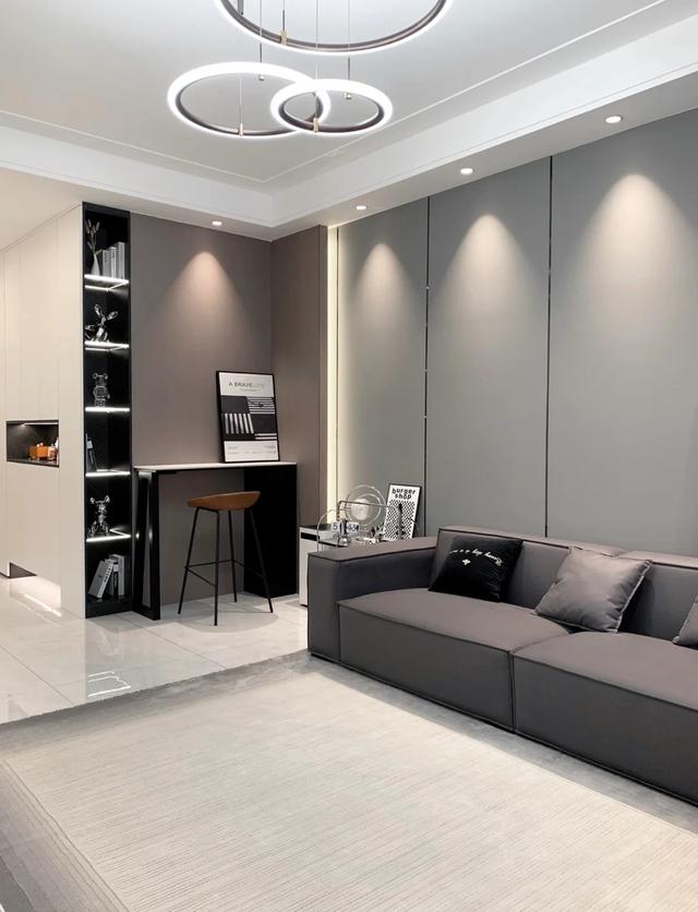 沙发背景墙5.25m,窗边20个窗帘盒,钛乳胶漆整墙石膏板,6条1cm黑色钛条,每条间距90cm。射灯刷墙时阴影效果非常突出,产生层次感,气氛饱满。