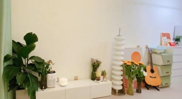 电视墙的一面设计成小清新风格。绿植、收纳柜、电视柜、吉他摆放整齐有序,就像一幅画卷,看起来相当自然温馨。