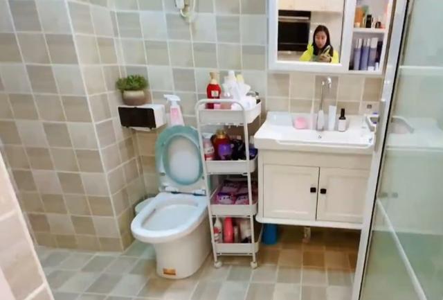 卫生间装修比较简单,地面和墙面都是灰褐色的防水墙砖,面积不大,但整体看起来比较开阔。