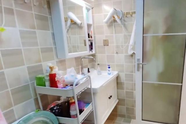 右边墙上还有吹风机和挂钩。吹风机的高度和位置都很方便。挂钩方便收纳玄关毛巾、浴巾、浴袍等物品。一看就是一个精致的少女家。