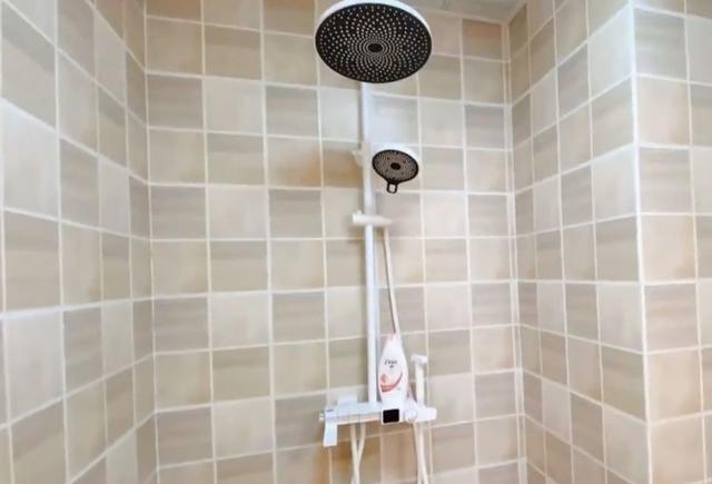 淋浴区的设计也比较简洁,就在一个凹进去的空间里面,配上浴帘,也能达到很好的干湿分离效果,价格也很实惠。