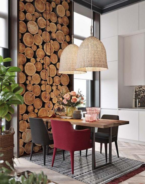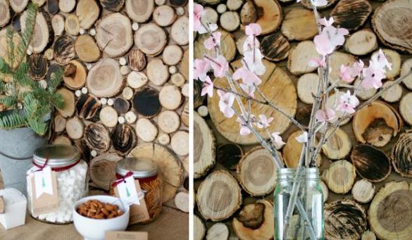 如果要问我这辈子见过最有创意的背景墙,那一定是她家的。她不刷漆、不做造型、不粘贴壁纸。就在院子里砍一棵树搬回家,将树切片,贴在墙上,突然在家里这么做背景墙,还挺新奇的。