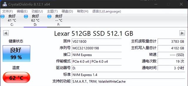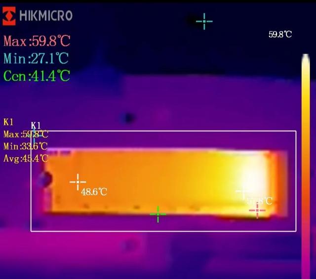 雷克沙Lexar NM760的另一大特点就是搭载了低功耗的12nm制程主控,搭配覆盖主控和颗粒的新一代复合材料散热贴,工作温度能够得到稳定控制。为了测试NM760的发热控制情况,我们对SSD进行温度压力测试。测试方法是在不带安装散热片时使用CrystalDiskMark完整跑一轮测试,然后用软件和热像仪记录SSD的温度情况。从测试的结果来看,运行完测试之后CrystalDiskInfo读取的硬盘温度为62°C,热成像仪测得主控附近的表面温度为59.8C。和其他SSD相比,这个温度表现算是很出色了。