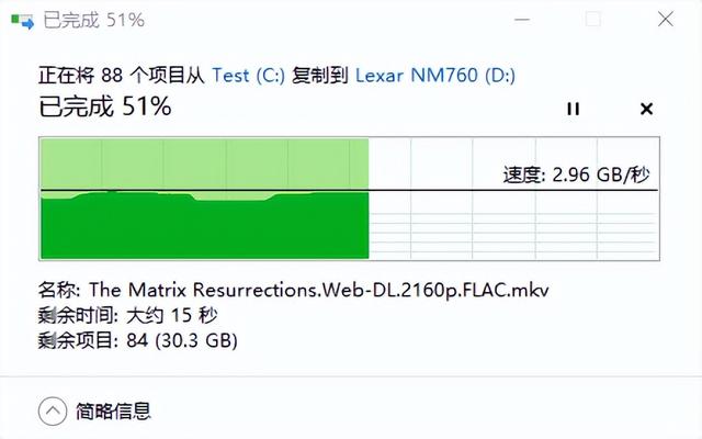 在最常规的文件拷贝中,我们选择了大容量的电影文件以及游戏客户端来分别模拟大文件和小文件的写入情况。首先复制了一部容量为63.2GB的电影文件,用时21.07秒,平均写入速度2.9GB/s。接下来拷贝拥有2760个小文件的《永劫无间》的游戏客户端,总大小19.4GB,一共用时8.94秒,平均写入速度2.2GB/s。如果是从另一块PCIe 4.0 SSD中读取或者写入文件,几乎不用怎么等待,连续写入大文件时也有SLC缓存的加持,使用效率大大提升。