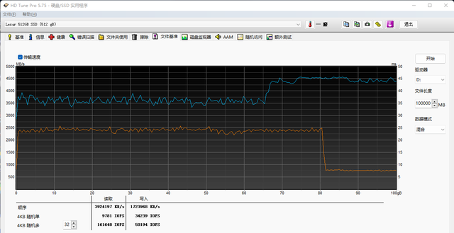 为了测试雷克沙Lexar NM760的SLC缓存策略,我们使用HD Tune中的文件基准对这块SSD进行测试。在空盘状态下,可以看到80GB前都是保持着比较高的写入速度,也就是可以得知它的缓存容量可以在80GB左右,随后写入速度降至800MB/s左右。对一款512GB的SSD来说80GB的SLC缓存完全够用了,能应对大多数时候的文件传输。