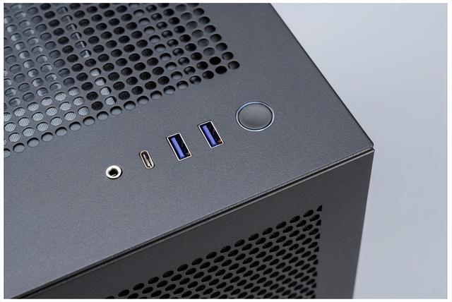 机箱的前置功能按键及接口位于顶盖前端,接口配置与高端的H710系列看齐。前置接口提供了2个USB 3.2 Gen 1 Type-A接口、1个USB 3.2 Gen2 Type-C接口以及1个3.5mm复合音频接口,方便玩家连接各种外接设备,电源键按照NZXT机箱的惯例在周围集成了一圈白色灯环。
