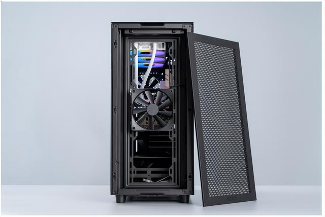 它的另一个特点就是方便拆卸组装,无论是前面板还是机箱上盖,全都采用了纯卡扣的设计,进一步减小了装机难度,也很适合那些喜欢经常更换硬件的DIY玩家。机箱计有独立的电源仓,电源仓上还留有大量的散热孔,如果采用非模组电源时,可以选择将前端的硬盘架移除,以获得更充足的线材放置空间。