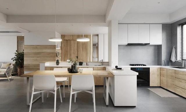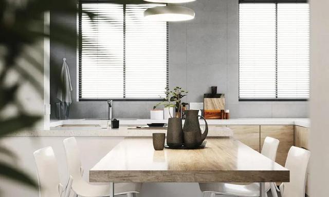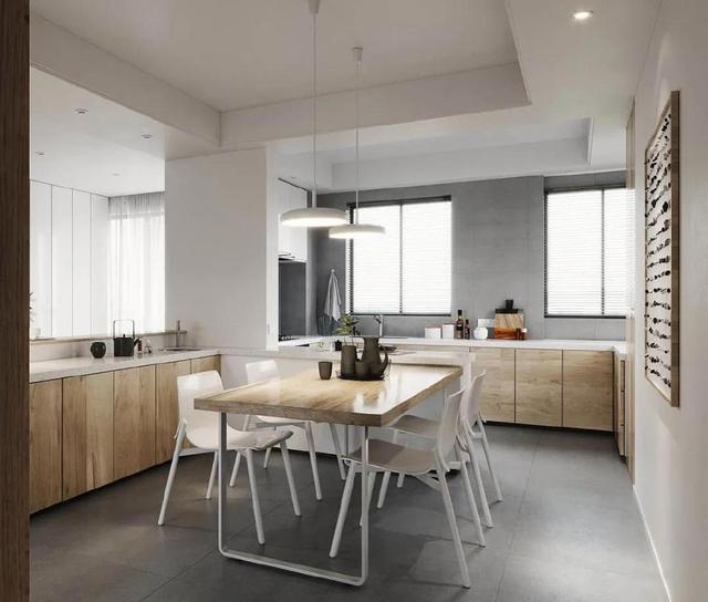 百叶窗将室外光线引入室内,让厨房充满自然光。延续厨房餐厅的配色,以白色和木质为主,搭配灰色地砖,简洁自然。