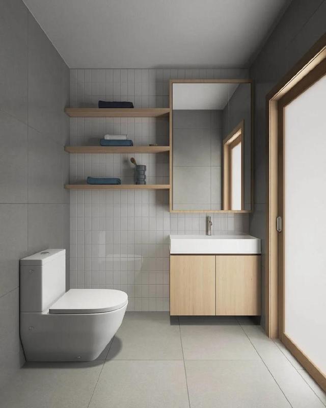卫生间镜柜和隔间用来存放洗漱用品,让卫生间台面不再凌乱,墙面和地砖同色,让空间有了整齐统一的线条感。