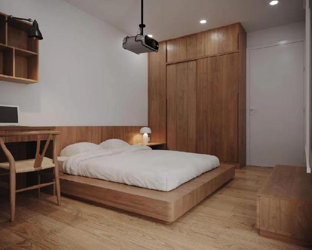 主卧整体布局简洁随性,墙面空间的暖色调搭配布床,营造出温馨舒适的画面。带木纹的木质书桌和衣柜被保留下来传递温暖的触感,投影仪的设计为居住环境增添了休闲趣味。