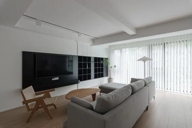 将与客厅相邻的卧室拆开放,扩大公共空间的面积,视觉效果更加宽敞通透。电视墙采用经典的黑白、黑开柜和白闭柜的组合,既有价值又有实用性。