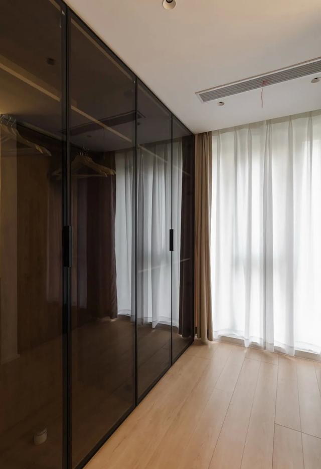次卧改造成衣帽间,定制了顶天立地的两面衣柜,采用茶色玻璃柜门,高级感十足。把主卫的干区搬到这里,大大解放了卫生间空间。