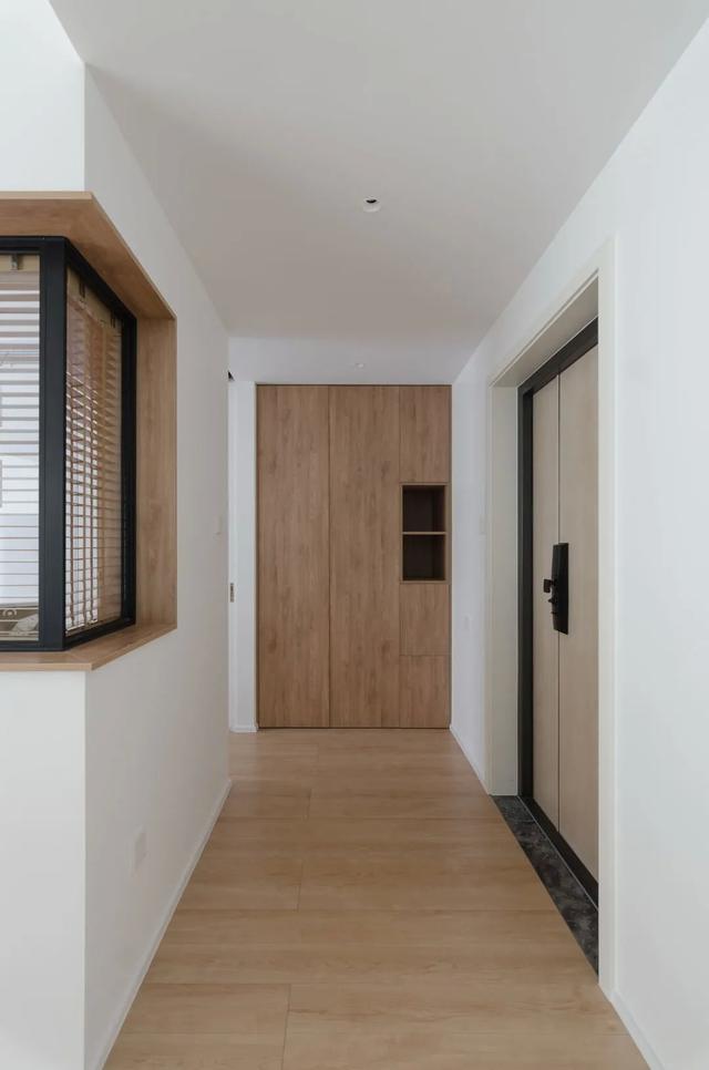 在玄关处,利用玄关右手边的墙搭建了一个入墙鞋柜。橱柜采用无把手设计,整洁、实用、美观、大方。