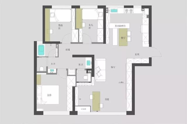 客厅没有茶几,比较宽敞。客厅一侧留出了一个学习空间,桌椅后面是两墙一矮柜的设计,再也不用担心东西放不下了。