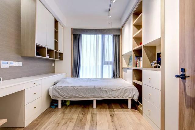 男生房间的配色也比较简单,两边是白色和木质的柜子。床放在中间位置,不耽误收纳,睡眠,学习。