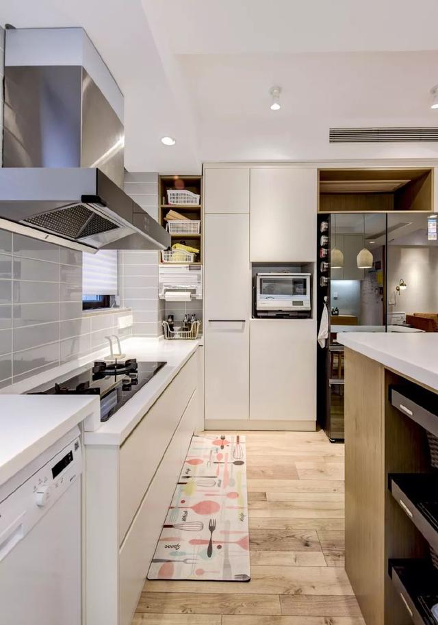 整个厨房的大部分空间都是用来收纳的,各种电器都嵌在橱柜里。再加上中岛露台的收纳设计,整个厨房的收纳面积非常充足。