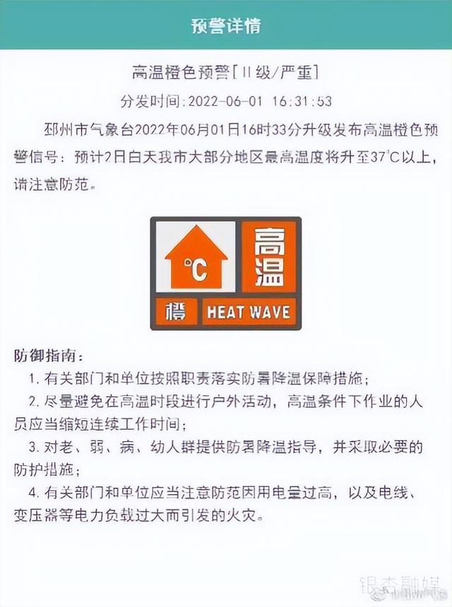 邳州市气象台2022年06月01日16时33分升级发布高温橙色预警信号:预计2日白天我市大部分地区最高温度将升至37℃以上,请注意防范。