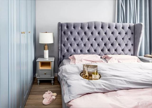 床头的软包选得有点过大了,这是一个小失误,当时就是为了这个颜色,所以选了这个软包。原本Jerry建议是铁艺床,我觉得有点单薄原本床头柜和电视下的斗柜都是一家定制的,但谁知道厂家没有按时发货,所以只能退了重买。Jerry不是很满意床头柜当中的浅木色,觉得和整个空间不是很搭调。