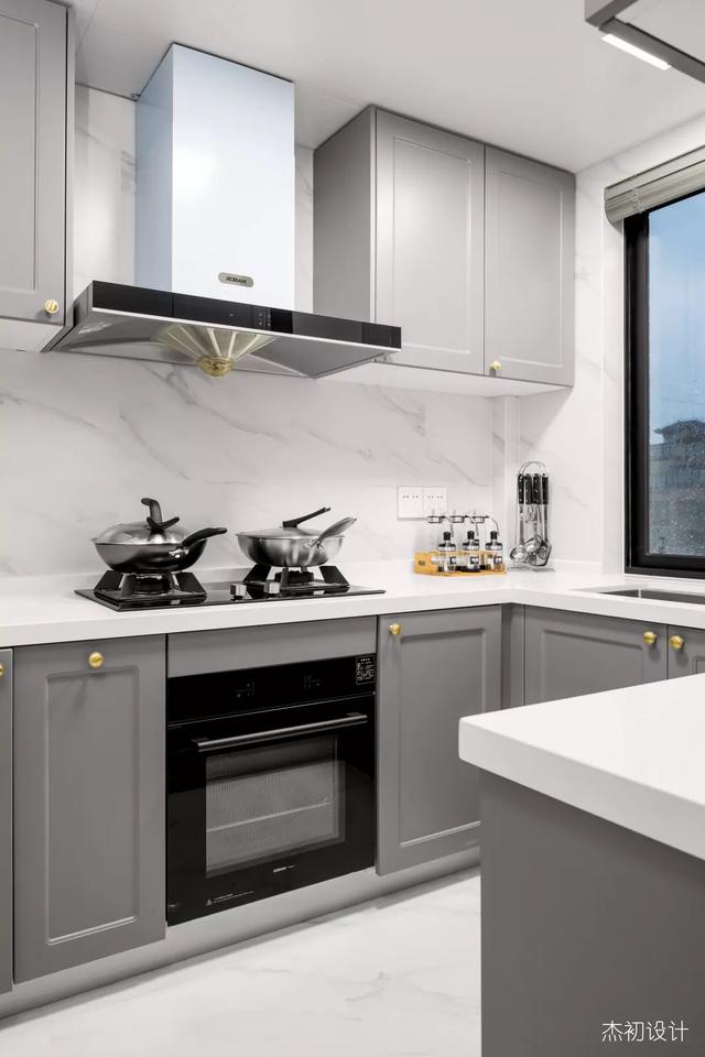 雾霾灰色的橱柜,显得很有格调,这里依然少不了金色的圆把手做配饰。