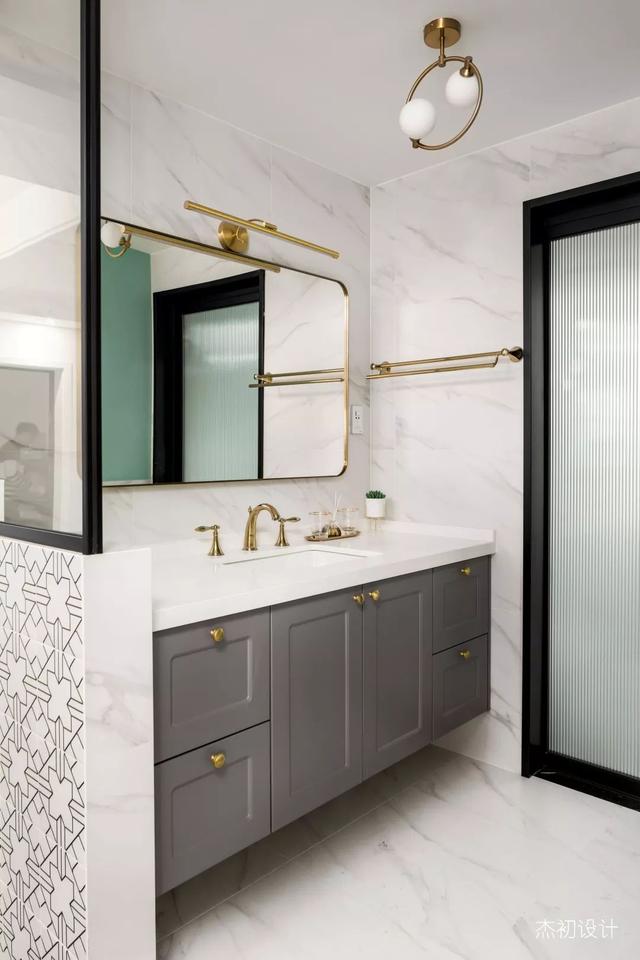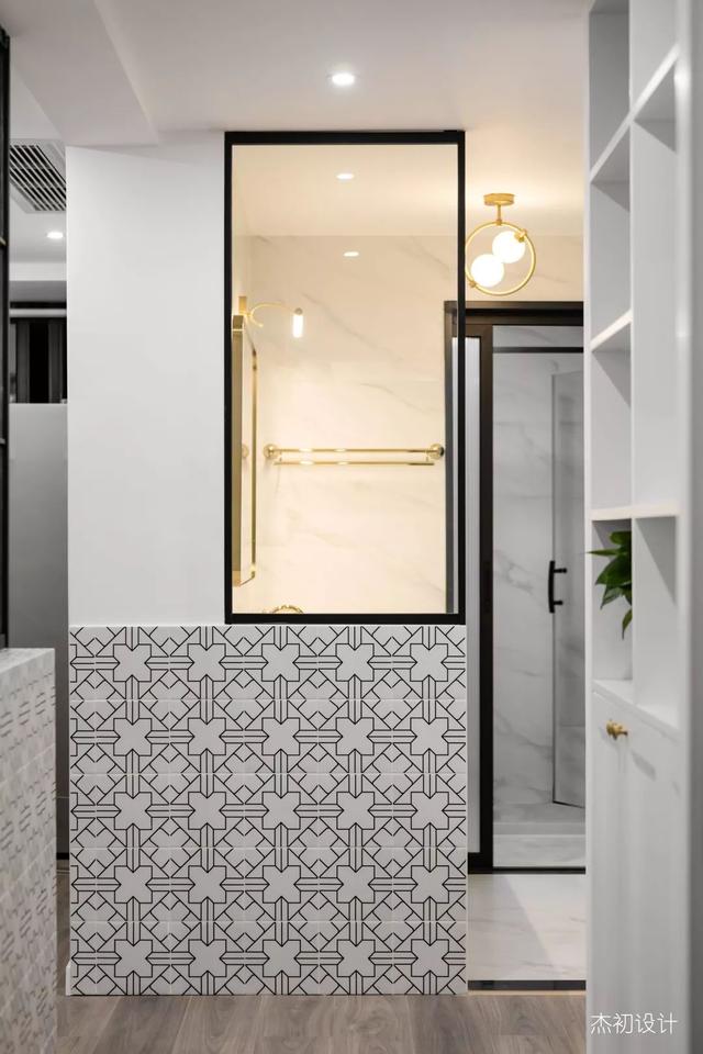 改造后的卫生间,从外部看,黑框玻璃和花砖隔断与客厅的相呼应。