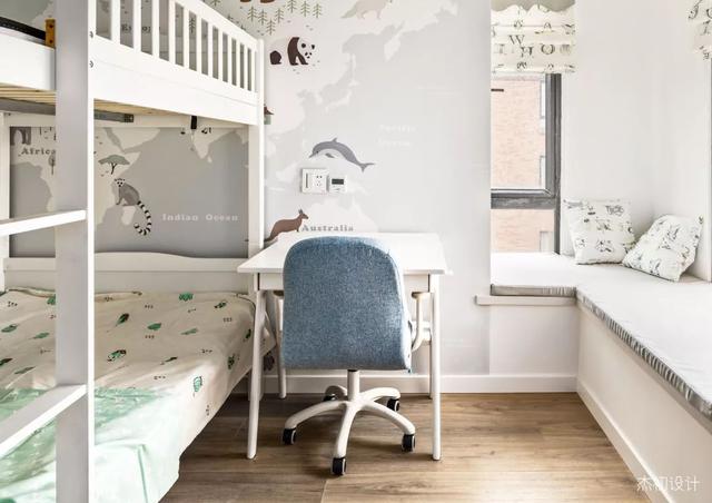 给未来宝宝准备的房间,还没确定生几个,但还是留了上下床,就算只有一个孩子,也可以给他用作玩乐的空间。飘窗台特别装点了一下,充分利用了这块绝佳的采光和风景。