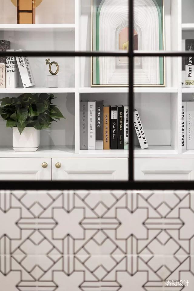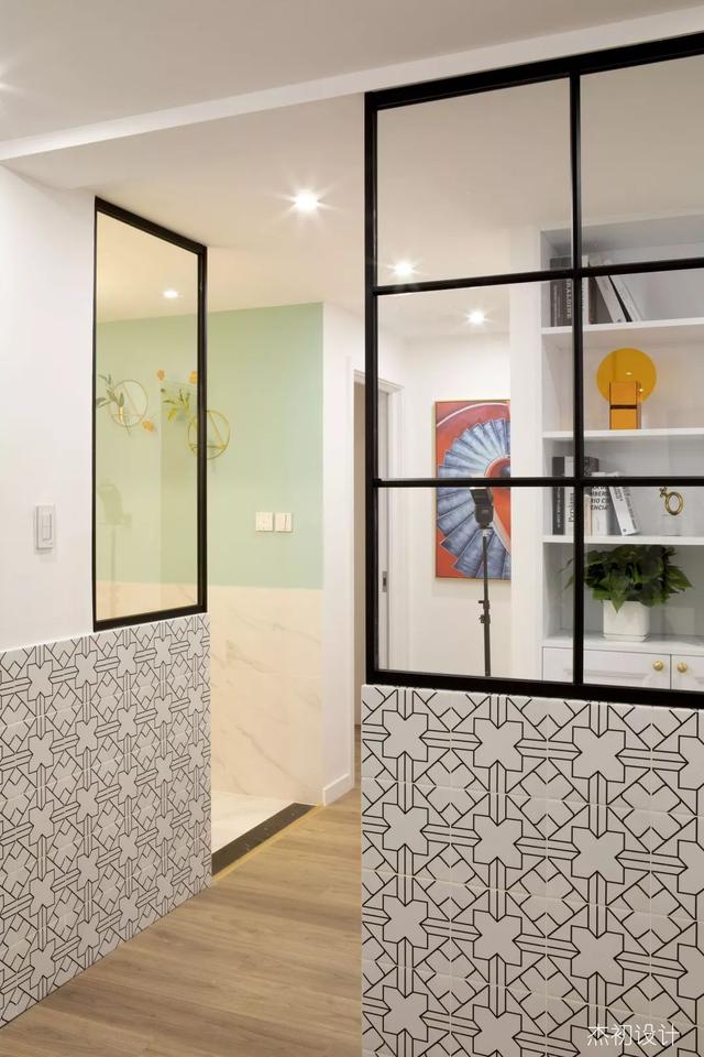 Jerry用花砖做了这面隔断墙,增添了家里小清新的感觉。上半部分我们使用了12宫格的黑框玻璃,后面是一面储物柜,可以放一些书和一些装饰品。一眼望去,非常精致美观。同时也保证了后面卧室的私密性。感觉这样的做法还挺有趣味的。