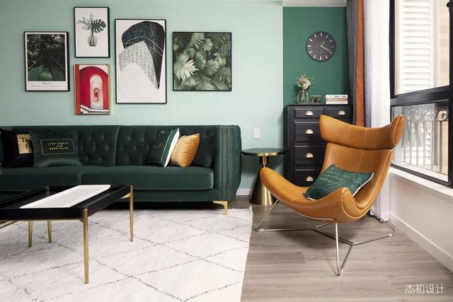 墙面主调、墙面配色、沙发,我们使用的都是深浅不一的绿色,在一起却显得十分和谐。沙发背景墙上的挂画,看着不过就是几幅画,但也是Jerry算好尺寸,想好怎么搭配才好看特别定制的,也是他亲手挂上去的。
