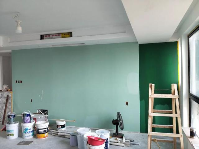 客厅的背景墙颜色,现在的感觉是很清新的绿色,搭配了深一些的草绿色,但原本购置的油漆颜色不能达到预期效果。Jerry是个非常负责的人,坚持要和效果图一致,我真的挺佩服他这点。我们下班之后大晚上的和油漆师傅在现场DIY,调了好几次之后才配出我们喜欢的效果来,碰上我们这样的“强迫症”业主,也真是难为油漆师傅了。