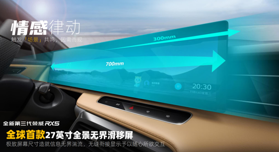 全新第三代荣威RX5搭载的这块27英寸全景无界滑移屏除了大,在情感的传递上可以说是跨维度交互,展现出全新“情感交互座舱”的特有魅力。