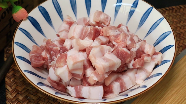 第一步、准备10块钱的五花肉切成小块,大小适中就可以了,不要太大也不要太小,,切好装碗备用。