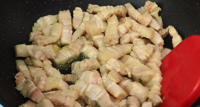 第三步、锅里油热后倒入五花肉煸炒,把五花肉的肥油炒出来,这样吃着就不腻了,多余的油脂可以盛出来,留着炒菜用。