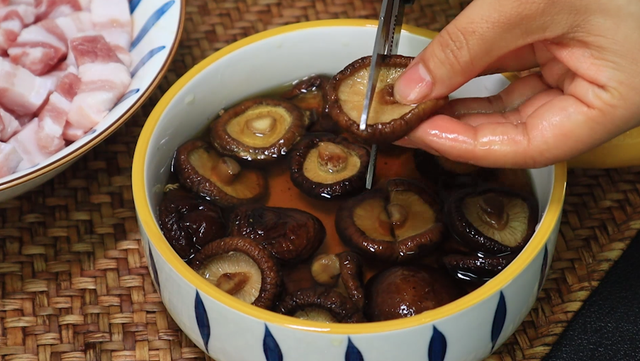 第二步、干香菇提前泡发,用剪刀把香菇一分为二,泡香菇的水要留着,后面要用到。