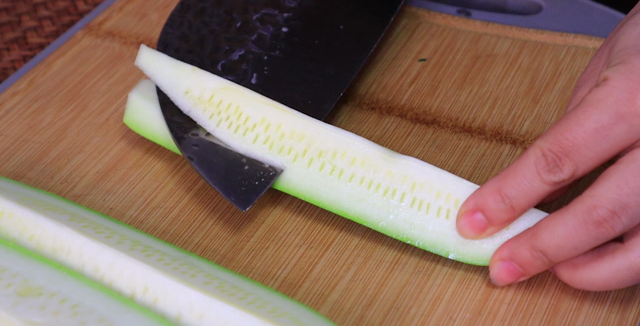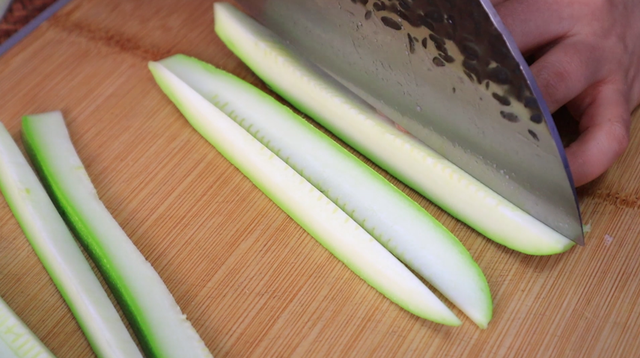 2、然后再把西葫芦切成长条,注意不要切得太粗了,像是筷子粗细就差不多。