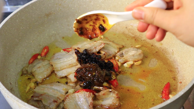 7、炒出肥油后下入蒜末和小米椒炒香,放一勺老干妈,一勺豉油海鲜酱,接着放入西葫芦大火翻炒。