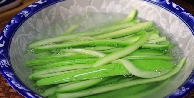 5、时间到了西葫芦也沙出了很多水分,变得柔软有韧性,倒入清水,把西葫芦淘洗干净,多清洗几次,然后挤干水分,咱们就可以开始炒了。