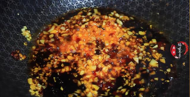 5,锅里倒入油,油热后下入蒜末炒香,加入一勺豆瓣酱炒出红油来,倒入调好的料汁儿,把料汁的香味完全炒出来,最后倒入少量的水淀粉炒至粘稠就可以出锅了。
