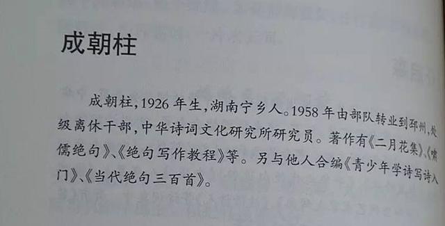 成老先生是湖南宁乡人,从小爱唱山歌。读初中时已会填词写律诗;读高中师范期间就写下了两万余字的《之字的研究》和一万余字的《颜习斋的学说与西洋实用主义》等多篇论文;解放后参军期间开始创作新诗。文革中精读古典籍,先后写下了三十万字的《历代国策》和《论李商隐的爱情诗》、《稼轩词思想述评》等论文。离休后专攻中华诗词的研究与创作,先后出版有《二月花集》、《绝句写作教程》、《啸儒绝句》、《成朝柱诗文选》、《成朝柱爱情诗》等作品多部。2016年,90高龄之际,又出版了《解放了的绝句》一书。