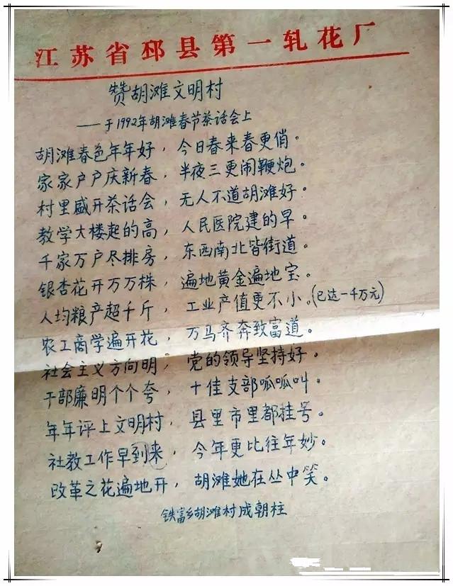 后几日送孩子去国强搏击训练馆,恰逢住在宋骆路边的原胡滩村老文书胡慎诺老叔在家。和他聊胡滩,聊成老先生,慎诺老叔拿出1992年胡滩春节茶话会上成老先生现场手写的一首诗,那钢笔字写得真是一丝不苟,极娟秀、认真。1926年出生的成老,那时66岁。慎诺老叔对成老的评价是:老实,谦和,满身才气,难得的好人。