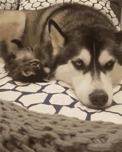 平时让主人头疼不已的二哈,面对小奶猫也充满了耐心,任由它在自己的身上爬来爬去。
