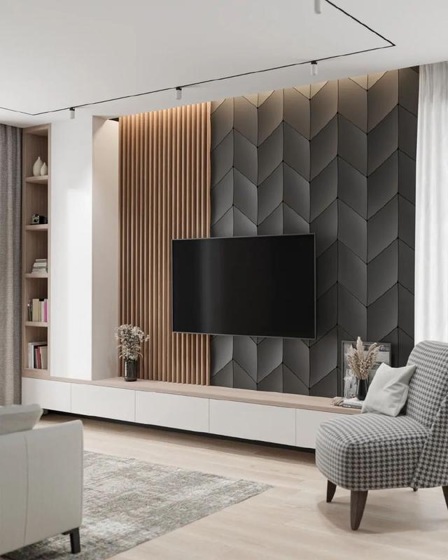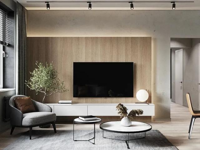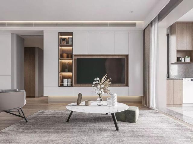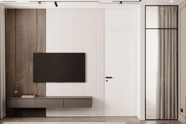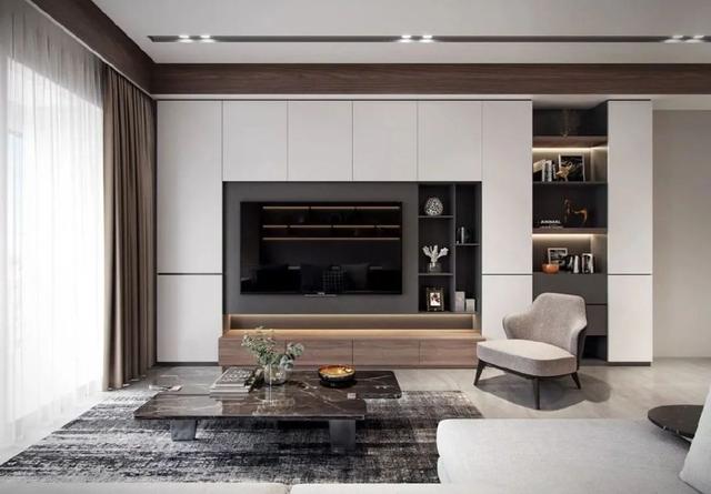 如果有收纳或者展示需求,那么这种电视背景墙一定适合你。它们在造型上相对简单,隐藏式橱柜展示柜电视的组合可以让整面墙看起来更加“统一”,非常有味道。
