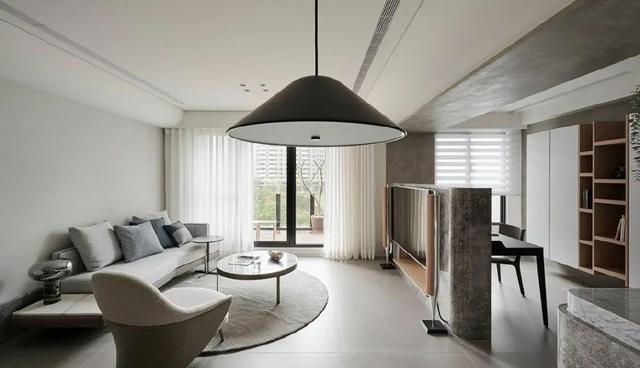 比如横厅就比较适合这种半隔断电视背景墙。根据空间需求,定制平行或垂直于入户门的半墙隔断,改善采光的同时还具有收纳隔断的功能。