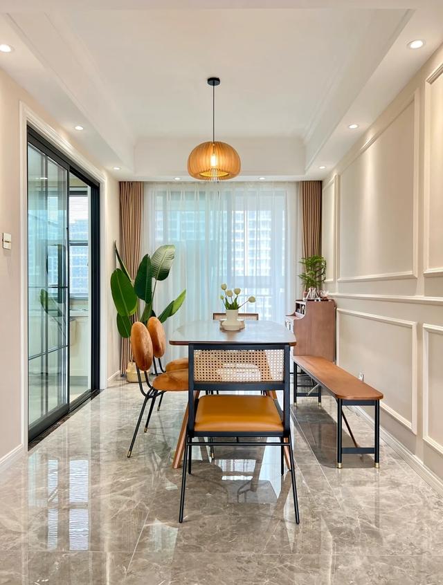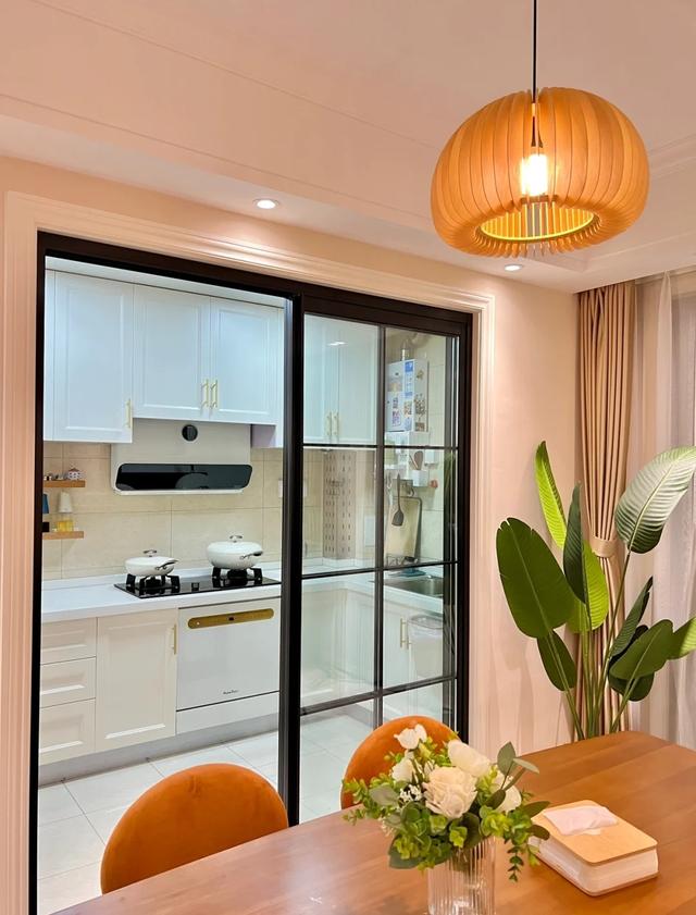 餐厅和厨房左右相连,中间用铝合金玻璃推拉门隔开。作为一个中国家庭,隔断可以很好的隔绝油烟,也能与家人保持一定程度的沟通。