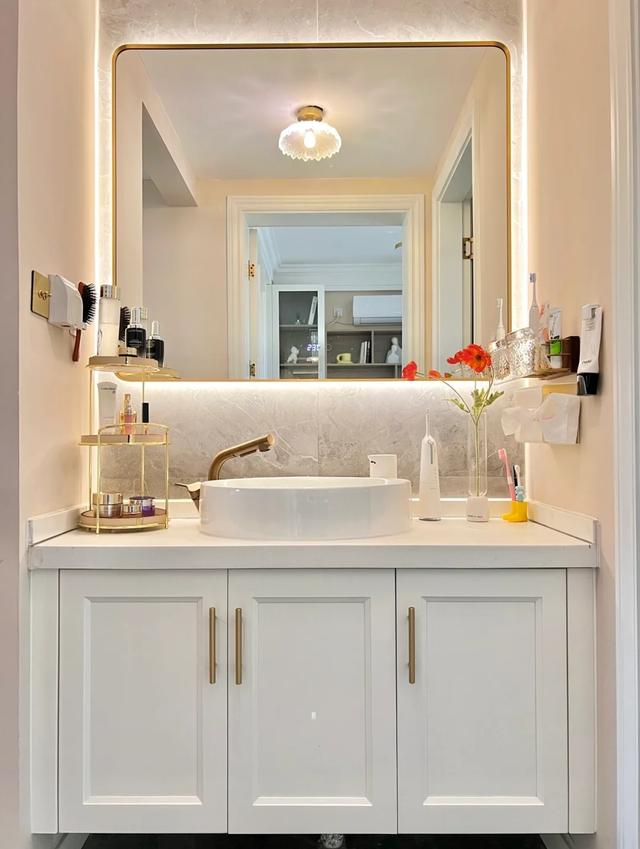 面盆柜是定制的,定制柜体会更贴合墙面没有卫生死角。超大的浴室镜也是根据墙面尺寸定制的,金色的镜框很复古。