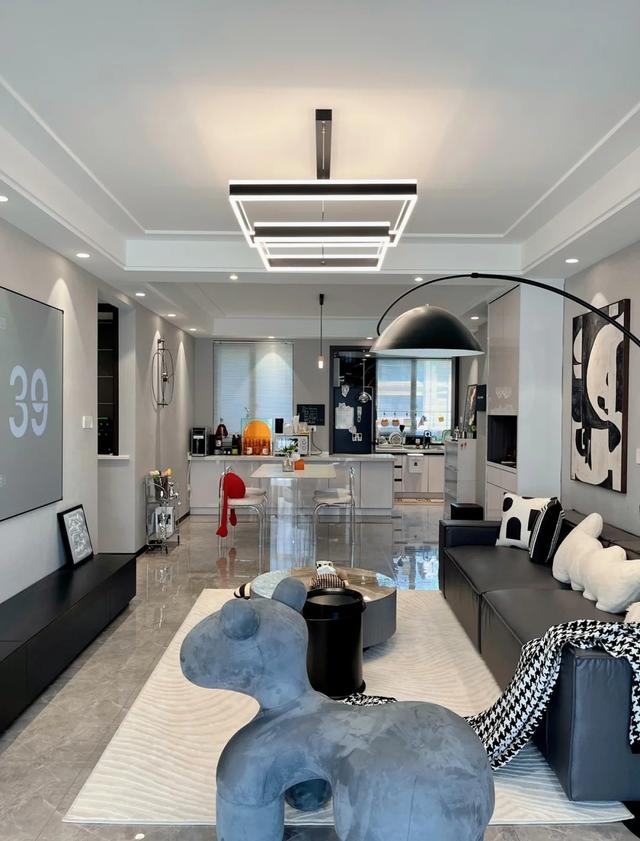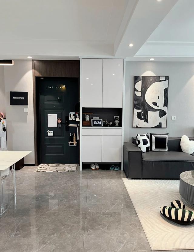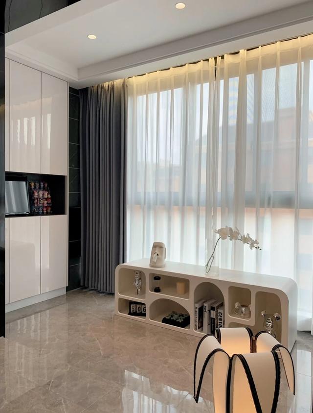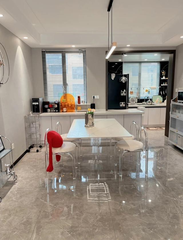 餐厅没有隔断,没有带顶的餐边柜,带餐吧的柜子,让整个空间更具延展性。使用了悬浮感十足的亚克力餐桌,让整个空间变得轻盈,整个客厅的颜值都有所提升。
