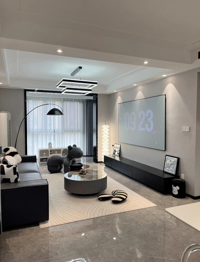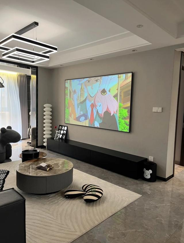 没有造型背景墙,铺浅灰色墙布,挂100寸防光幕,简约大气。好马配好鞍,这种幕布投射的画面对比度和质感都很好。当然,投影仪的亮度必须达到一定的数值。
