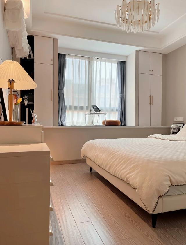 卧室的背景墙是牛奶咖啡色的壁布,搭配水晶羽毛吊灯,三种颜色变化,柔和的中性光很舒服。床是米色的,支架式,床底卫生,容易打理。整件简单大气,能感受到什么风格拍的好。