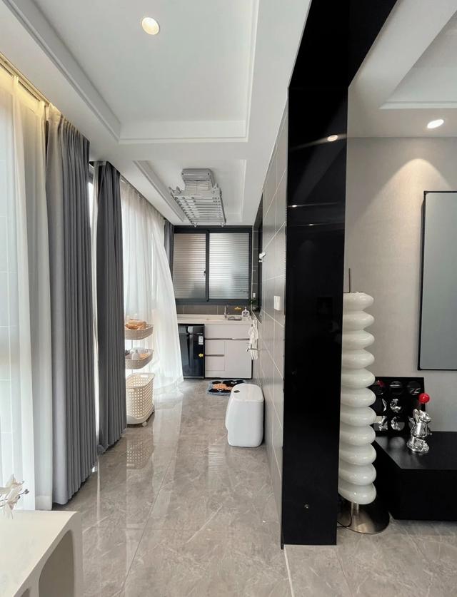阳台另一侧定制了一个洗衣柜,顶部安装了隐形晾衣架,提高了房子的功能。同时也提高了阳台的利用率和实用性。拿个配置推车,上面放清洁用品,下面放脏衣服,底部轮滑的设计,灵活好用。
